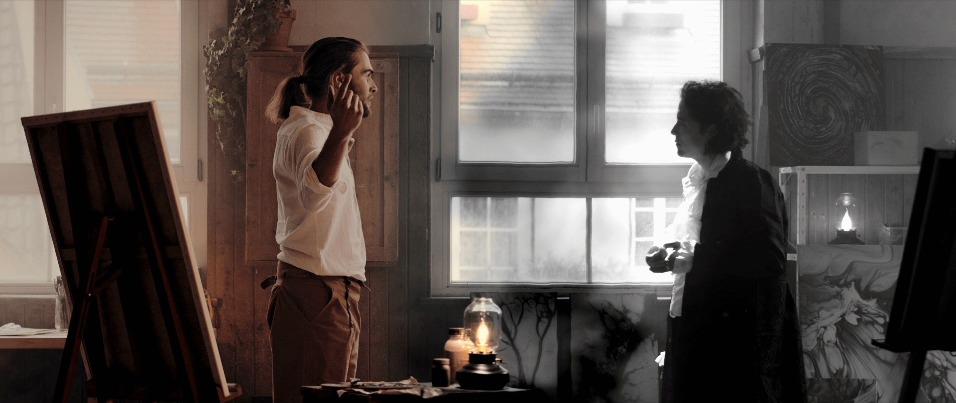 The aura of the devil fights against that of the artist in the behavior of both in conversation.